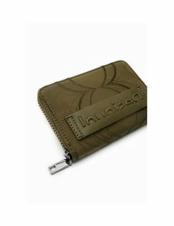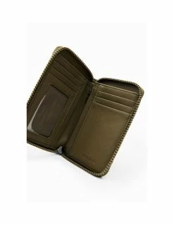 Portefeuille cercles en relief synthétique kaki confectionné à partir de fibres durables créant un tissu orné de cercles brodés. Il est doté de plusieurs poches et compartiments.