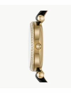 La montre Carlie a trois aiguilles en acier inoxydable jaune. Elle est dotée d’un cadran nacré et d’un joli bracelet en cuir écoresponsable noir. Taille du boîtier: 28mm.