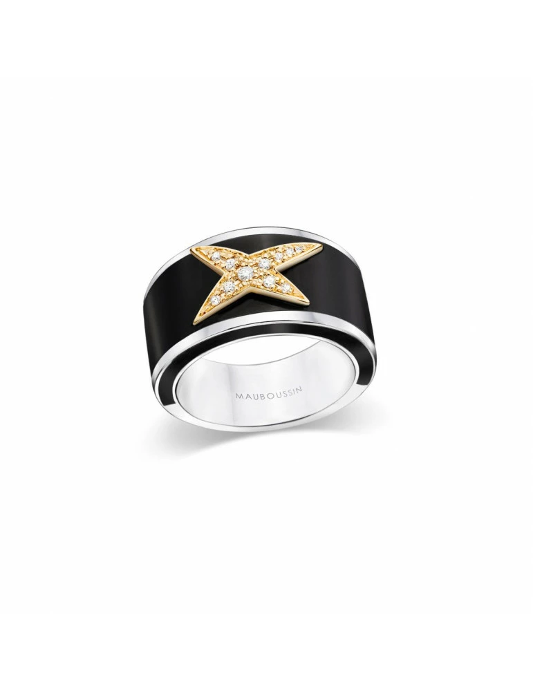 Bague en argent avec laque noire brillante portant la célèbre étoile mauboussin en or jaune 750/1000 avec diamants (0.15carat). Poids d’argent 12gr, largeur de bague sur le dessus 10mm.