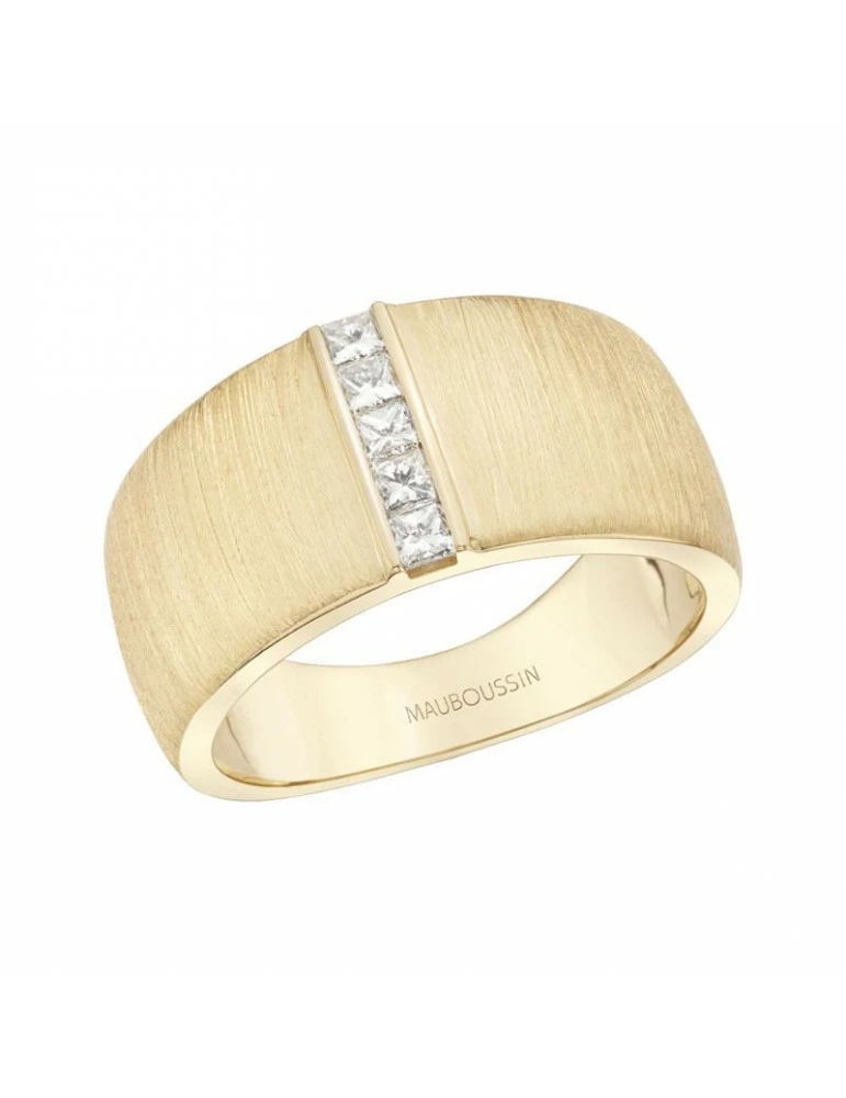 Bague finition mat striée avec ligne de 5 diamants taille princesse pour 0.19carat. Poids d’or environ 5gr variant légèrement selon la taille.