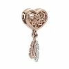 Chaque côté du charm est orné en son centre d’un cristal de synthèse taille rond brillant, entouré de deux rangées d’oxydes de zirconium incolores sertis pavé. Ce bijou est également décoré sur les côtés d’un motif en forme de cœur ajouré.