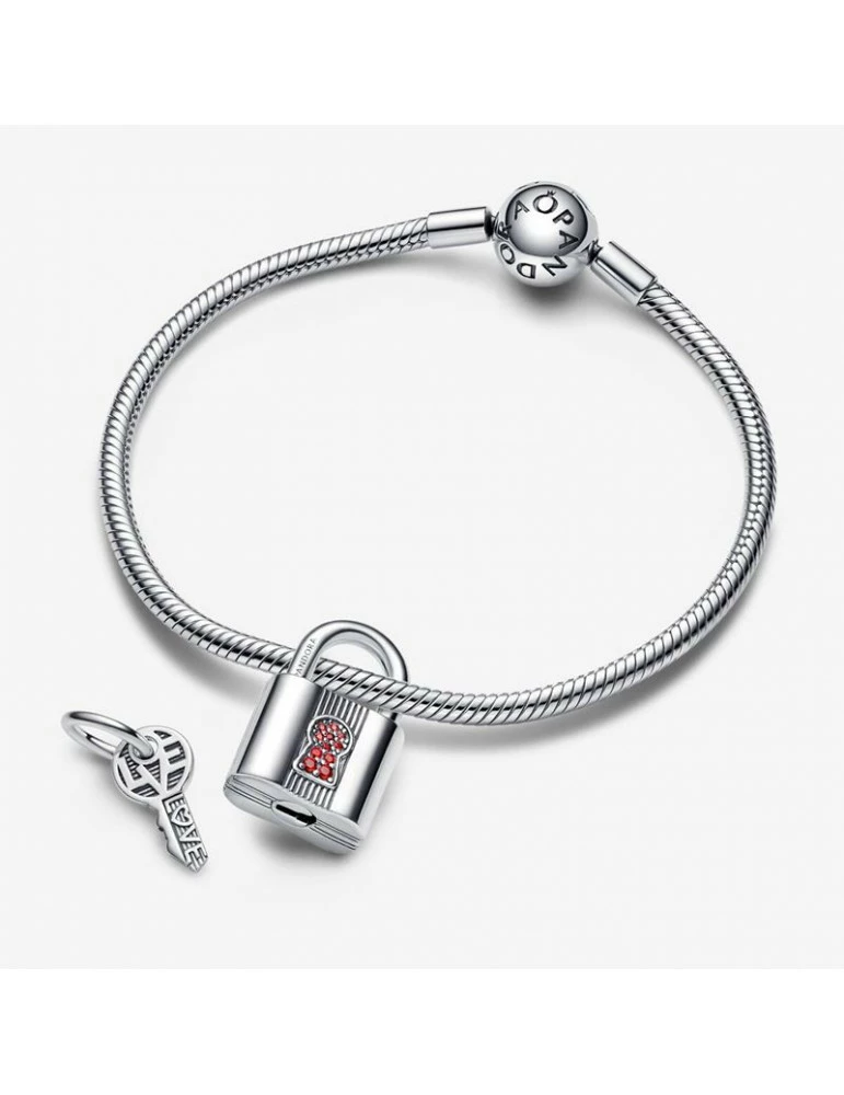 Ce charm Cadenas et Clé en argent est compatible avec des colliers et des bracelets, ce charm peut être porté au cou en pendentif ou en charm à un bracelet. La serrure est pavée de cristaux de synthèse rouges et le mot « Love » ( Amour ) est gravé sur la clé.