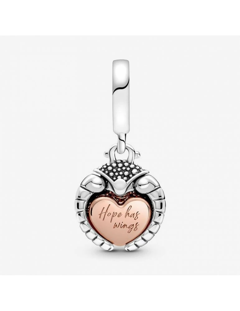 Ce charm est doté d’ailes en argent 925/1000 qui se déploient pour révéler un cœur étincelant en métal doré à l’or rose 585/1000 renfermant une un diamant de laboratoire taille rond brillant. Il est gravé au verso du cœur :« Hope has wings » (L’espoir a des ailes).