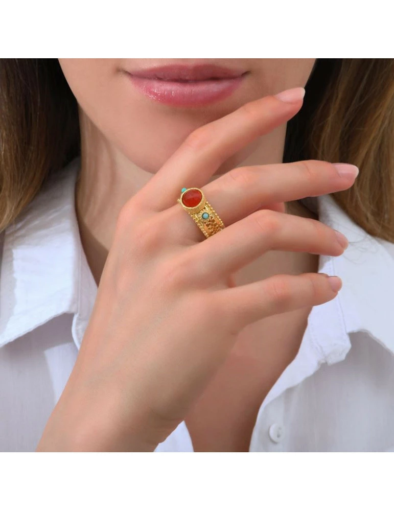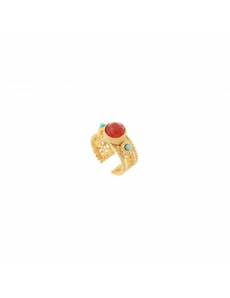La bague est en métal dorée. Cette dernière est sertie de cornalines et de chrysocolles turquoises. Taille ajustable.