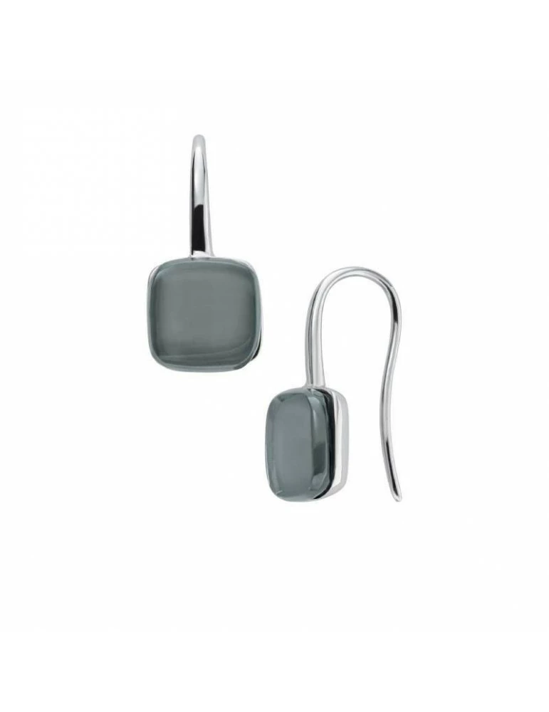 Boucles d’oreilles forme carré composées de pierres de couleur gris foncé. La longueur de chaque boucle d’oreille est de 2 cm.