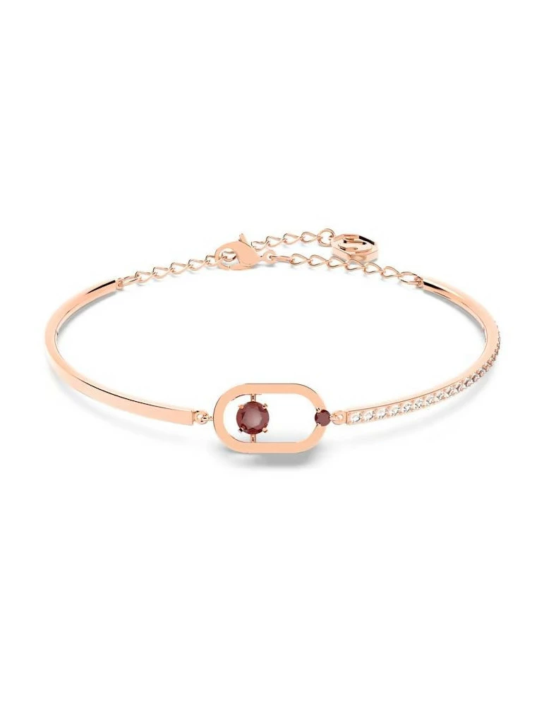 Bracelet jonc en métal rhodié avec chainette de sécurité en plaqué doré-rose. Doté d’un cristal rouge motif rond. Taille: 16cm.