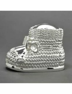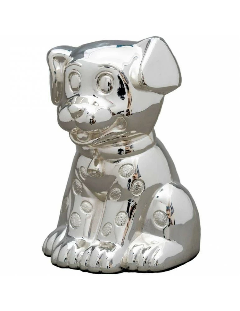 Tirelire Chien en métal argenté poli. Dimensions : 9 x 14cm