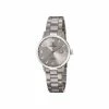 Montre dame tout acier, boîte de 30mm réhaussée d’un verre saphir, fermoir boucle déployante. Cadran gris, aiguilles noires, chiffres romains et date à 6h.