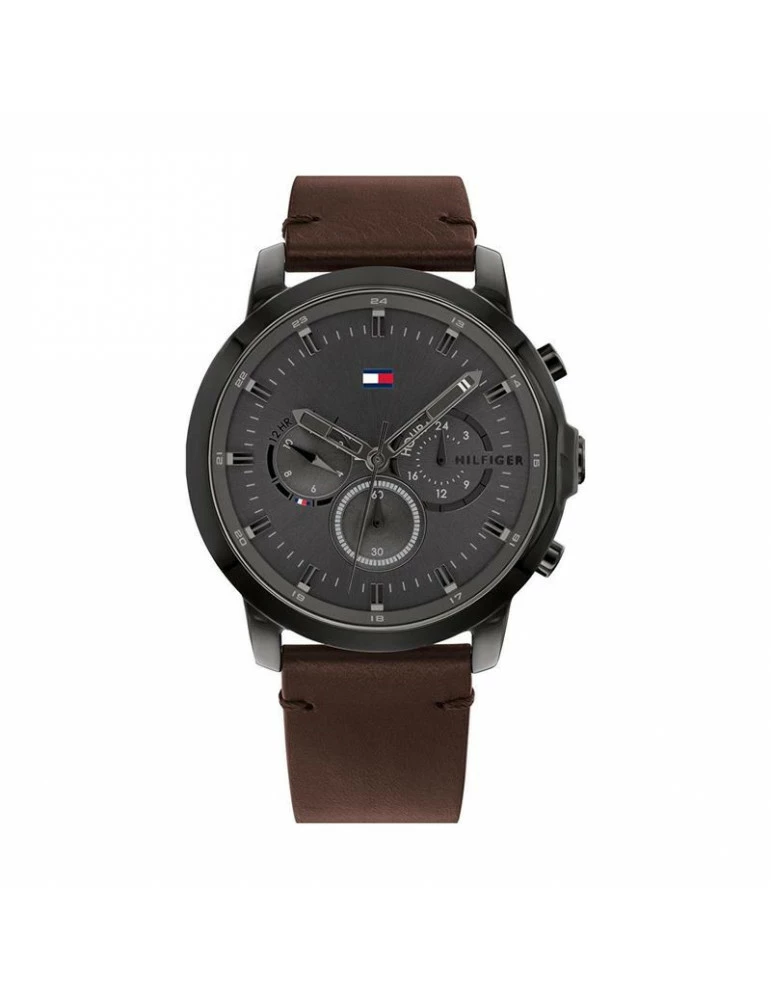 La montre Jameson en acier présente un mouvement multifonction. Dotée d’un cadran noir et d’un bracelet cuir brun. Taille du boîtier: 44mm.